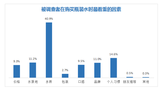 40.9%的被调查者购买瓶装水最看重的因素是饮用水水质,这说明消费者在选择饮用水上不再单纯以价格为导向。